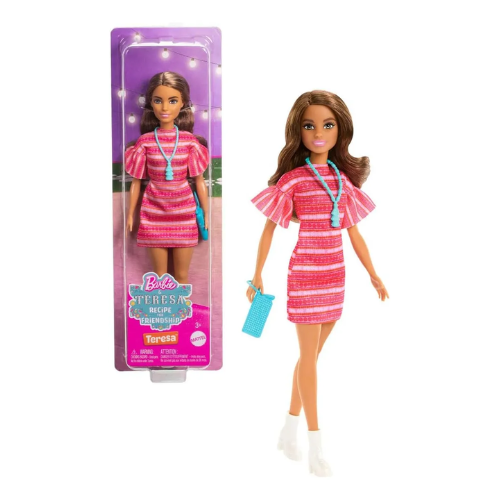 Não sei meu CEPA imaginação ganha vida com a boneca Teresa, inspirada no filme Barbie e Teresa: Receita de Amizade. Essa boneca fashion recria a personagem com seu icônico vestido rosa estampado e botas brancas. Para completar o visual, dois acessórios em azul brilhante — uma bolsa clutch e um colar com borlas, que remetem à peça usada no filme. Crianças e fãs a partir de 3 anos vão adorar recriar cenas ou criar novas aventuras cheias de sabor! A boneca não pode ficar em pé sozinha. As cores e as decorações podem variar.