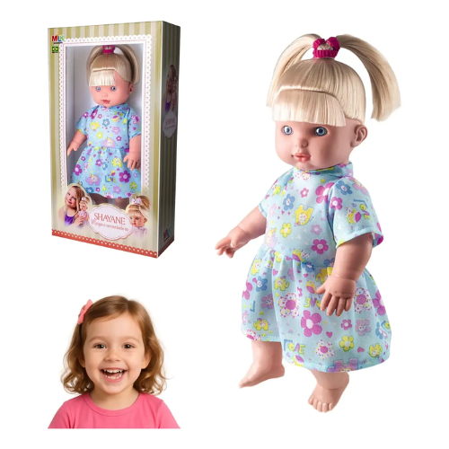 Não sei meu CEPBoneca Shayane – Milk Brinquedos A Boneca Shayane é uma encantadora companheira para crianças a partir de 3 anos. Confeccionada em vinil macio, ela oferece uma experiência tátil agradável e segura. Seu design inclui um vestido colorido e cabelos loiros presos em chuquinhas, proporcionando uma aparência fofa e cativante. Características do Produto: Material: vinil macio Altura da boneca: aproximadamente 34 cm Idade recomendada: a partir de 3 anos Certificação INMETRO: 001518/2019 – OCP 0006 Embalagem: caixa litografada com dimensões de 42 cm (altura) x 23,5 cm (largura) x 9 cm (profundidade) Peso com embalagem: aproximadamente 368 g Conteúdo da embalagem: 1 boneca Shayane Benefícios Educativos: Desenvolvimento da empatia: ao cuidar da boneca, a criança aprende sobre carinho e responsabilidade Estímulo à criatividade: as brincadeiras de faz de conta incentivam a imaginação Coordenação motora: vestir e cuidar da boneca auxilia na melhora da coordenação motora fina Observações: As cores e estampas do vestidinho podem variar conforme o lote de fabricação Produto certificado pelo INMETRO, garantindo segurança para a criança Aviso legal Recomendado a partir dos 3 anos.