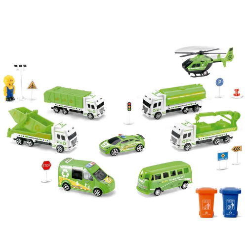 chame a Turma da Diversão e Junte-Se à Equipe Ecológica com o Kit de Carrinhos de Reciclagem! com Baldes de Lixo, Carros, Caminhões e Até Helicóptero, É Hora de Reciclar e Brincar. e Não Se Esqueça do Herói da Sustentabilidade, Placas de Trânsito e Um Distintivo Para Salvar o Planeta em Grande Estilo!
